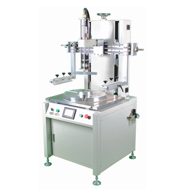 針對印刷面下凹的圓盤形產(chǎn)品,普通的絲印機(jī)平移運(yùn)動的刮刀無法完成印刷。我司為此開發(fā)了旋轉(zhuǎn)刮刀式絲印機(jī),可以有效解決環(huán)狀下凹表面的印刷問題。